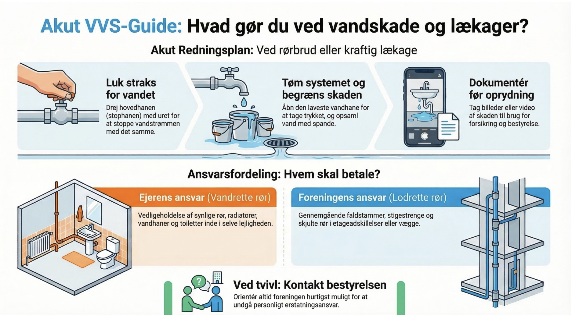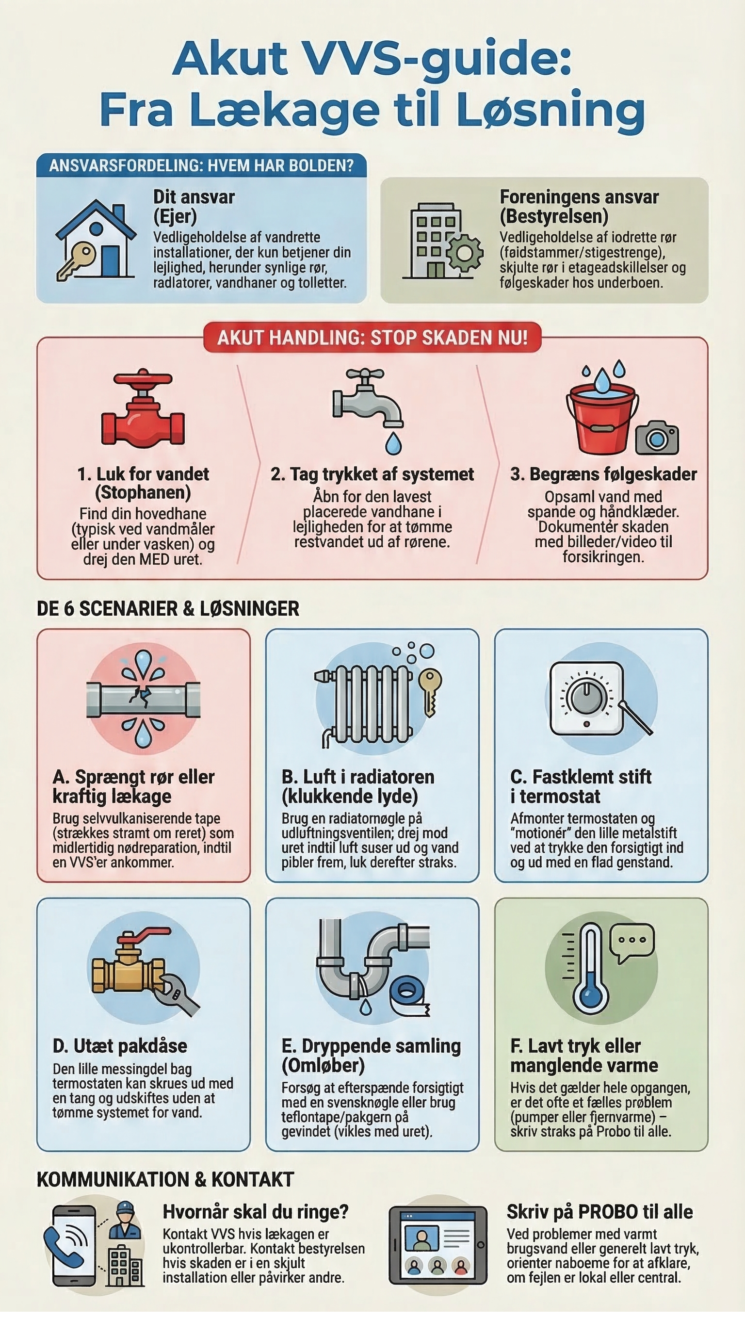 - VVS-døgnvagt: Kontakt VVS'er fra håndværkerlisten, hvis du har en ukontrollerbar lækage, der kræver øjeblikkelig professionel indgriben, samt informer bestyrelsen via Probo.